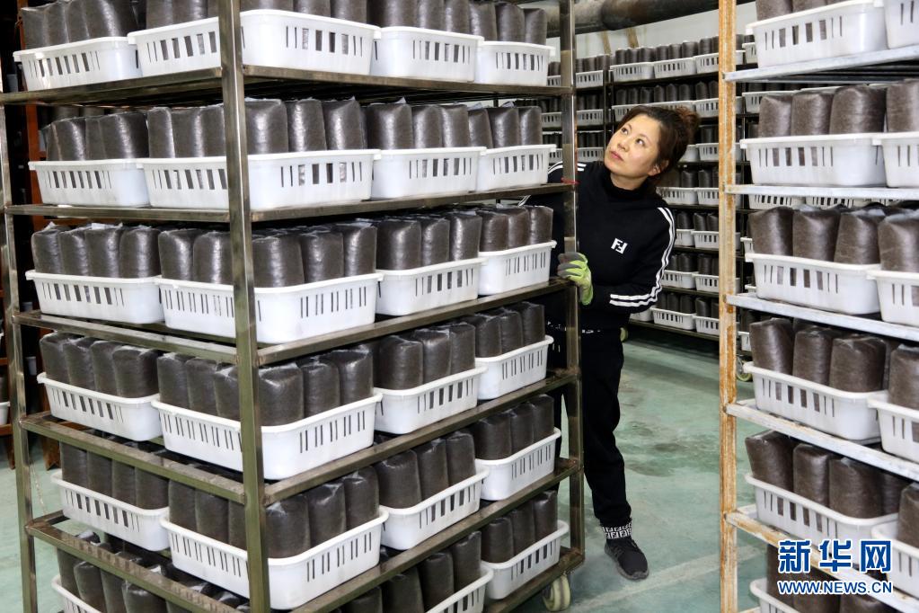 在黑龍江省寶清縣寶清鎮(zhèn)雙泉村的食用菌基地,食用菌種植專業(yè)合作社理事長(zhǎng)鞠秀芹查看菌包(4月16日攝)。新華社發(fā)