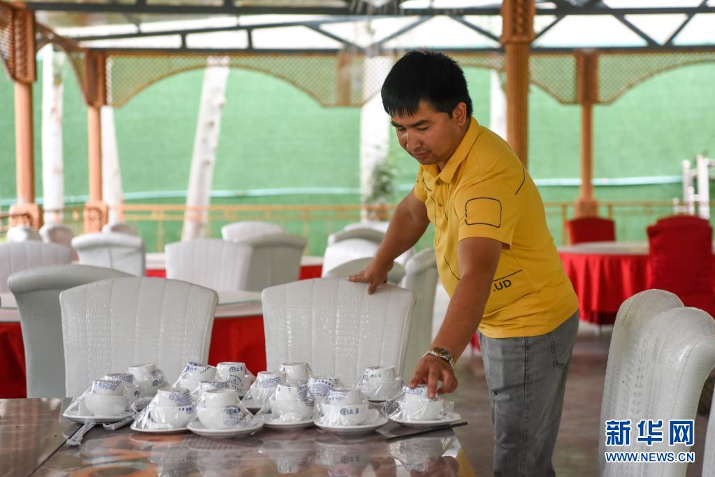 7月5日,在新疆阿克蘇市依干其鄉(xiāng)巴格其村,村民在自己經(jīng)營(yíng)的農(nóng)家樂里忙碌。新華社記者 丁磊 攝