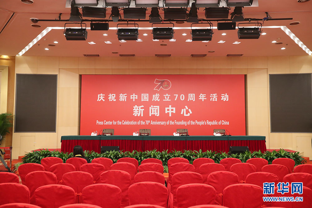 9月24日,慶祝中華人民共和國(guó)成立70周年活動(dòng)新聞中心在北京梅地亞中心二層新聞發(fā)布廳舉辦第一場(chǎng)新聞發(fā)布會(huì)。圖為新聞發(fā)布會(huì)開始前的現(xiàn)場(chǎng) 。新華網(wǎng)記者 陳競(jìng)超 攝?