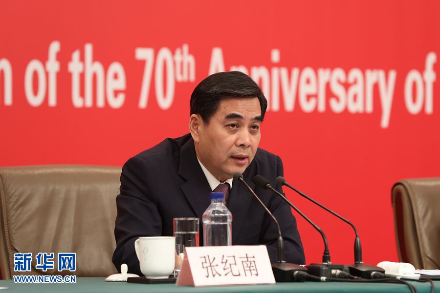 9月26日,慶祝中華人民共和國成立70周年活動新聞中心在北京梅地亞中心二層新聞發布廳舉辦第二場新聞發布會。圖為人力資源和社會保障部部長張紀南介紹相關情況。新華網記者 郭小天 攝