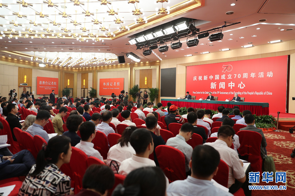 9月27日,慶祝中華人民共和國成立70周年活動新聞中心在梅地亞中心二層新聞發布廳舉辦第三場新聞發布會,中央農村工作領導小組辦公室主任、農業農村部部長韓長賦,國務院扶貧開發領導小組辦公室主任劉永富介紹全面建成小康社會,扎實推進脫貧攻堅和鄉村振興,并回答記者提問。圖為發布會現場。新華網 陳杰 攝