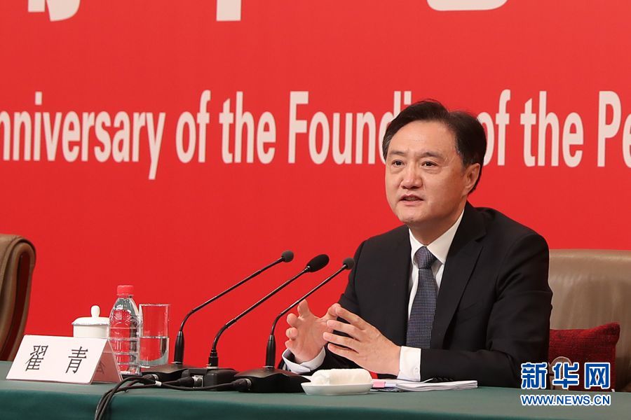 9月29日,慶祝中華人民共和國成立70周年活動新聞中心在北京梅地亞中心二層新聞發布廳舉辦第四場新聞發布會。圖為生態環境部副部長翟青介紹相關情況。新華網記者 焦鵬 攝