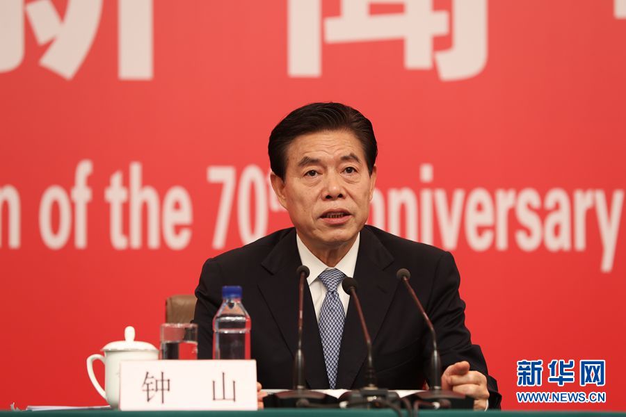 9月29日,慶祝中華人民共和國成立70周年活動新聞中心在北京梅地亞中心二層新聞發布廳舉辦第五場新聞發布會。圖為商務部部長鐘山介紹相關情況。新華網記者 郭小天 攝