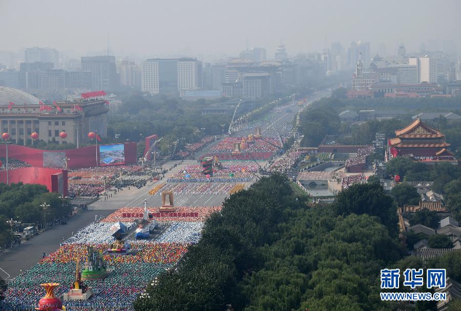 10月1日上午,慶祝中華人民共和國成立70周年大會在北京天安門廣場隆重舉行。 這是群眾游行彩車通過長安街。 新華社記者李一博攝