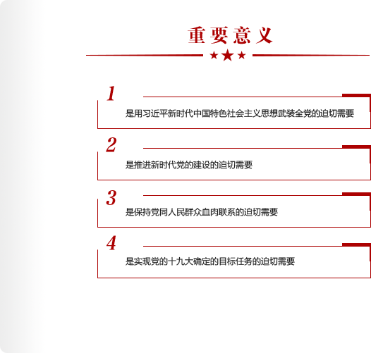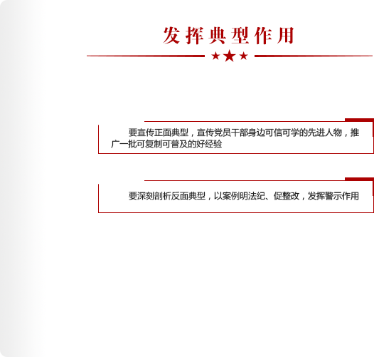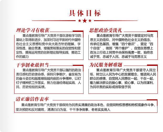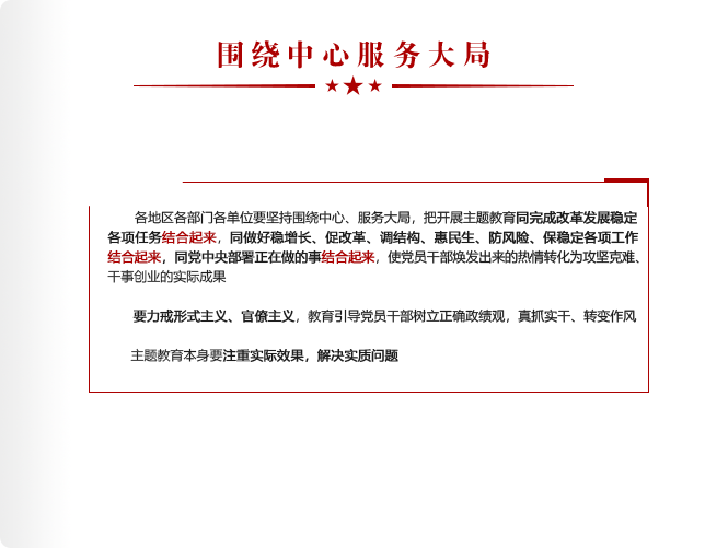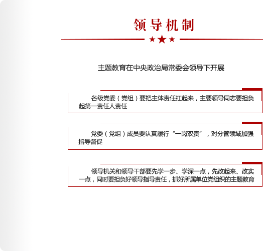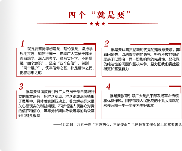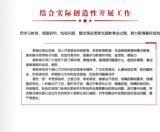 • 主題教育是以習近平同志為核心的黨中央作出的重大部署,領導干部要提升政治站位,擔負好領導指導責任,抓好所屬單位黨組織的主題教育。對消極對待、敷衍應付的,要嚴肅批評;對走形變樣、問題嚴重的,要給予組織處理,切實解決執行能力不強、執行底氣不夠等問題,確保主題教育取得實實在在成效。 [詳細]