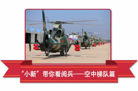 方隊(duì)由26架直升機(jī)和7架教練機(jī)組成。國(guó)旗和軍旗分別由1架直升機(jī)在正下方懸掛、由2架直升機(jī)護(hù)衛(wèi),組成兩組三機(jī)梯隊(duì),呈品字形依次通過(guò)。緊隨其后的是由20架直升機(jī)組成“70”字樣,寓意中華民族以抗戰(zhàn)勝利為起點(diǎn)走向偉大復(fù)興的征程。這是我國(guó)在閱兵中首次采用紀(jì)念數(shù)字的編隊(duì)飛行。