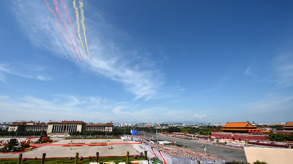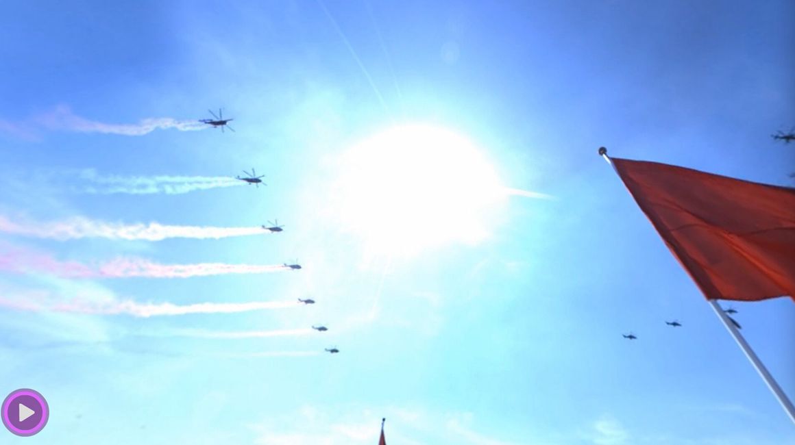 蔚藍(lán)的天空中,6架直升機(jī)護(hù)衛(wèi)著國(guó)旗和軍旗、20架直升機(jī)飛成“70”字樣、7架教練機(jī)拉出7道彩煙——率先從天安門(mén)廣場(chǎng)飛過(guò)的空中護(hù)旗方隊(duì),揭開(kāi)了勝利日大閱兵的序幕。9月3日,雄偉的天安門(mén),寬闊的長(zhǎng)安街,見(jiàn)證著這場(chǎng)大閱兵的一個(gè)又一個(gè)精彩瞬間。