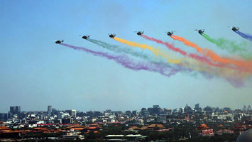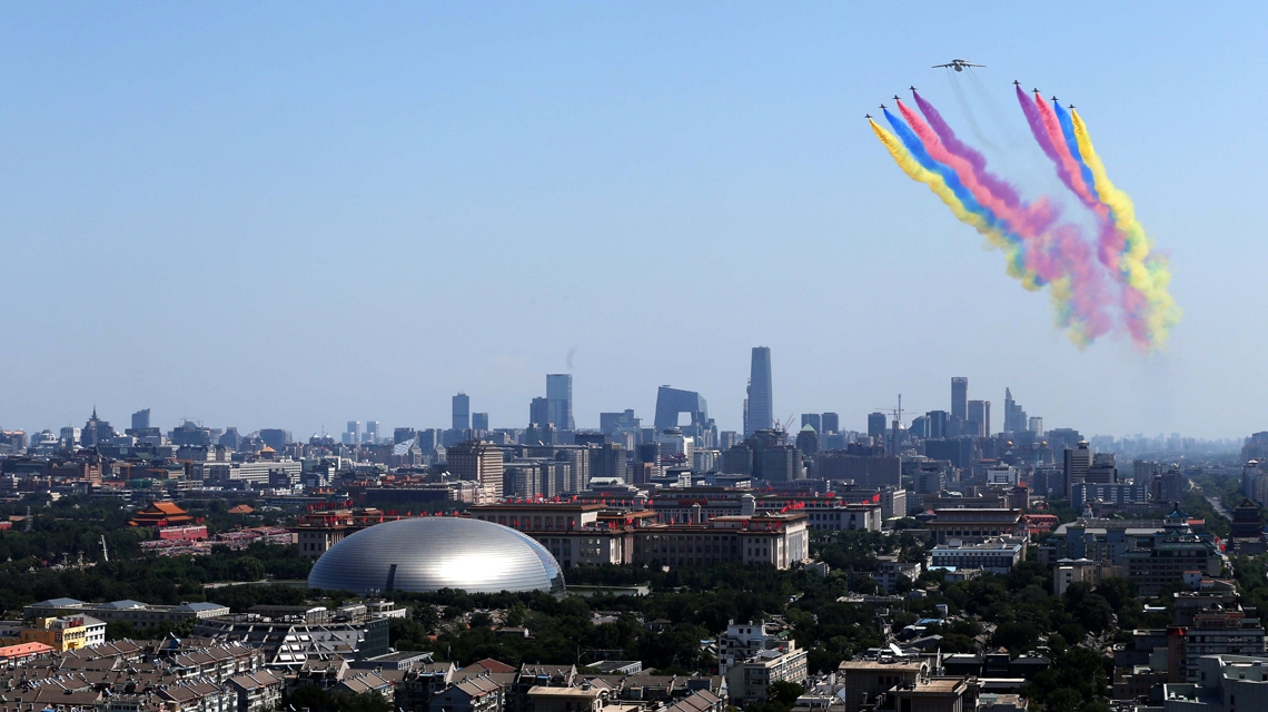 直升機(jī)梯隊(duì)飛行在北京上空