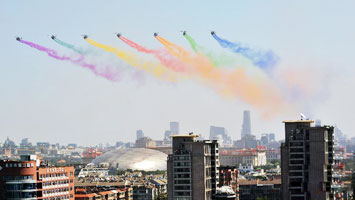 - 領(lǐng)隊(duì)機(jī)梯隊(duì)飛過(guò)天安門(mén) 8道彩煙絢麗奪目