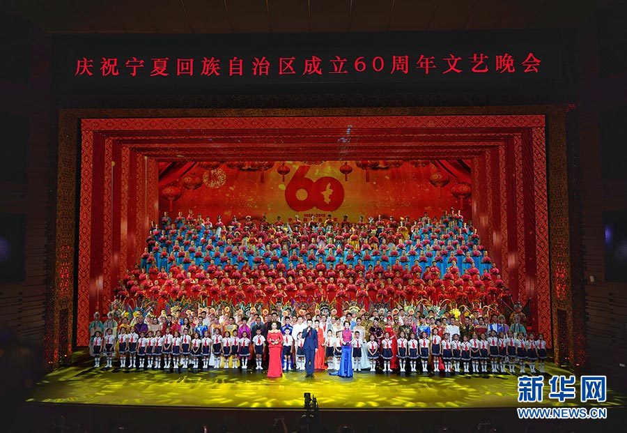 9月19日,慶祝寧夏回族自治區成立60周年文藝晚會《綻放新時代》在寧夏人民劇院上演。中共中央政治局常委、全國政協主席、中央代表團團長汪洋和各族各界干部群眾等共約1400人觀看演出。 新華社記者 張領 攝