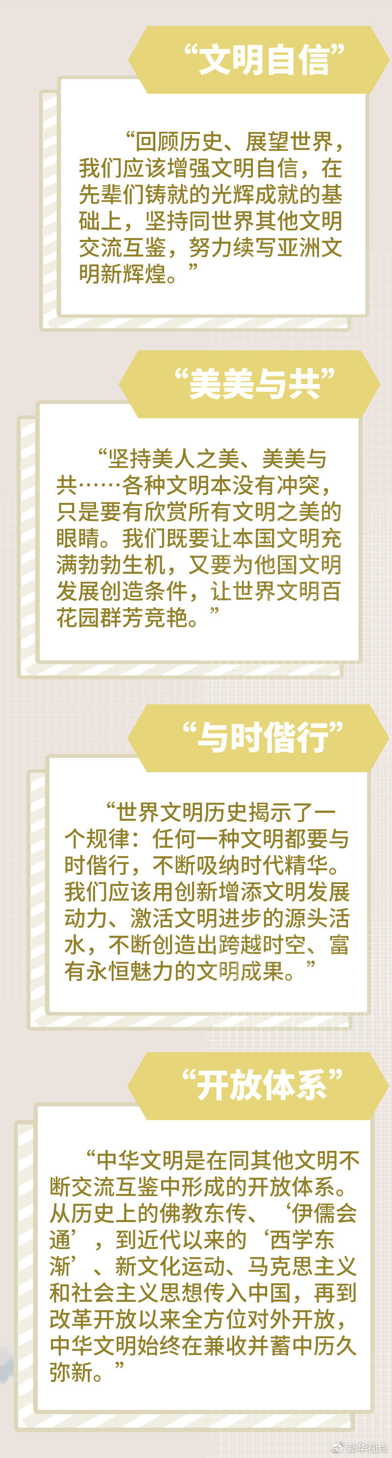 總結亞洲輝煌的文明成果,闡釋中華文明深刻內涵,介紹不同文明“相處之道”,并提出亞洲人民三個期待和加強世界上不同國家、不同民族、不同文化交流互鑒的四點主張……
