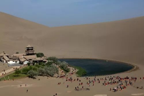 游客在甘肅省敦煌市鳴沙山月牙泉景區游覽。新華社發(張曉亮 攝)