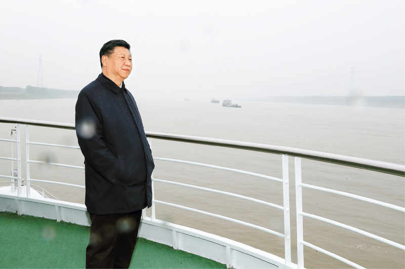 2018年4月26日下午,中共中央總書記、國家主席、中央軍委主席習近平在武漢主持召開深入推動長江經濟帶發展座談會并發表重要講話。這是座談會前,習近平于25日上午乘船沿江察看兩岸生態環境和發展建設情況。 新華社記者 謝環馳/攝