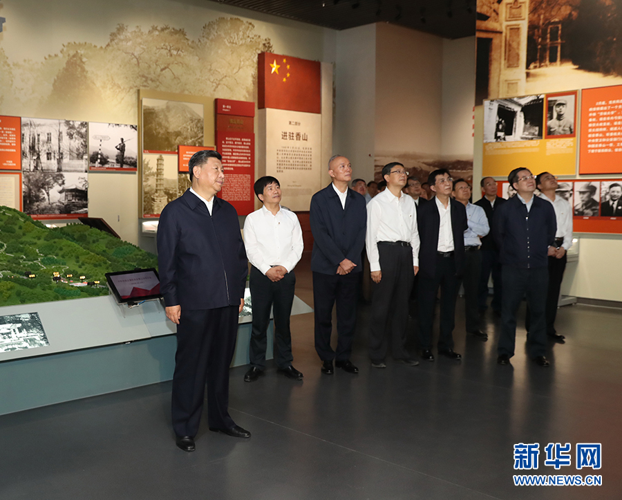 離開來青軒,習近平來到香山腳下的香山革命紀念館,參觀了《為新中國奠基——中共中央在北京香山》主題展覽。新建成的紀念館莊重大氣,“四梁八柱”的雨棚造型寓意黨中央在香山為新中國搭建四梁八柱。28根廊柱,象征中國共產黨從建黨到建立新中國28年的奮斗歷程。南廣場上矗立著高19.49米的國旗桿,寓意中華人民共和國誕生于1949年。主題展覽由“進京‘趕考’”、“進駐香山”、“繼續指揮解放全中國”、“新中國籌建”、“不忘初心、牢記使命、永遠奮斗”5個部分組成,按歷史脈絡,通過800多張圖片、報照、地圖、表格和1200多件實物、文獻和檔案,全景式生動呈現中共中央在香山期間領導全國各族人民,完成民族獨立和人民解放的歷史使命、開啟中國歷史發展新紀元的光輝歷程。
