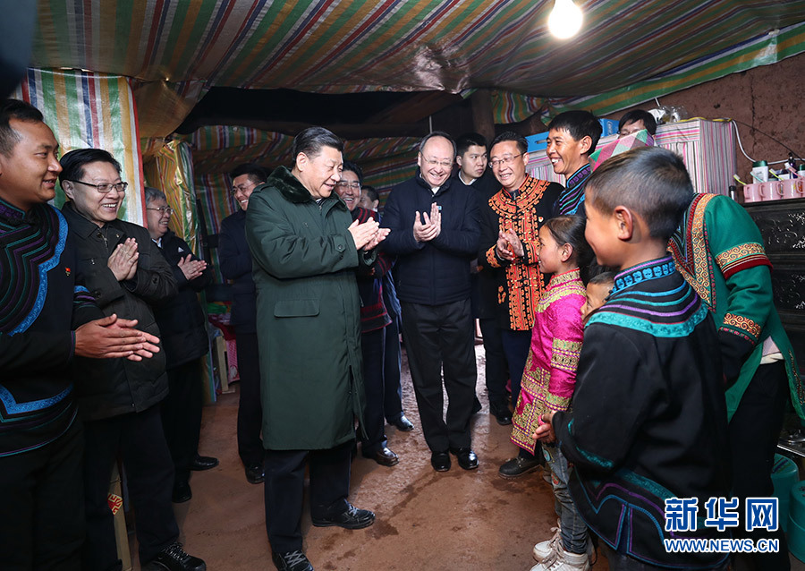 2018年2月11日,農(nóng)歷春節(jié)來(lái)臨之際,習(xí)近平在四川涼山彝族自治州昭覺(jué)縣三岔河鄉(xiāng)三河村貧困戶吉好也求家中看望,聽(tīng)10歲小女孩吉好有果唱《國(guó)旗國(guó)旗真美麗》。 新華社記者 鞠鵬 攝