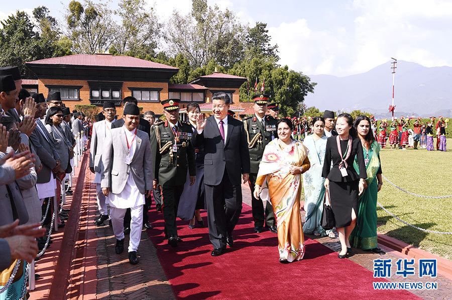 班達(dá)里在機(jī)場為習(xí)近平舉行隆重歡送儀式。尼泊爾副總統(tǒng)普恩、總理奧利、聯(lián)邦議會(huì)聯(lián)邦院主席蒂米爾西納、所有內(nèi)閣成員、軍方高級將領(lǐng)參加。