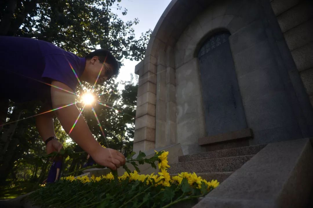 2015年9月3日,在天津南開大學校園內的西南聯合大學紀念碑前,師生代表向南開抗戰英烈獻花