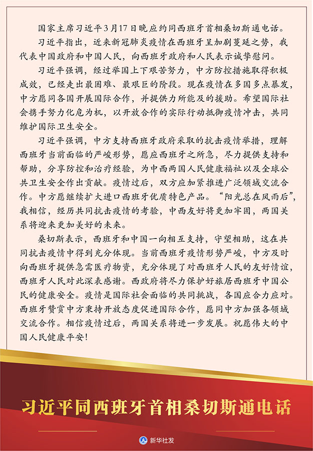 習近平強調,中方支持西班牙政府采取的抗擊疫情舉措,理解西班牙當前面臨的嚴峻形勢,愿應西班牙之所急,盡力提供支持和幫助,分享防控和治療經驗,為中西兩國人民健康福祉以及全球公共衛生安全作出貢獻。疫情過后,雙方應加緊推進廣泛領域交流合作。中方愿繼續擴大進口西班牙優質特色產品。“陽光總在風雨后”,我相信,經歷共同抗擊疫情的考驗,中西友好將更加牢固,兩國關系將迎來更加美好的未來。