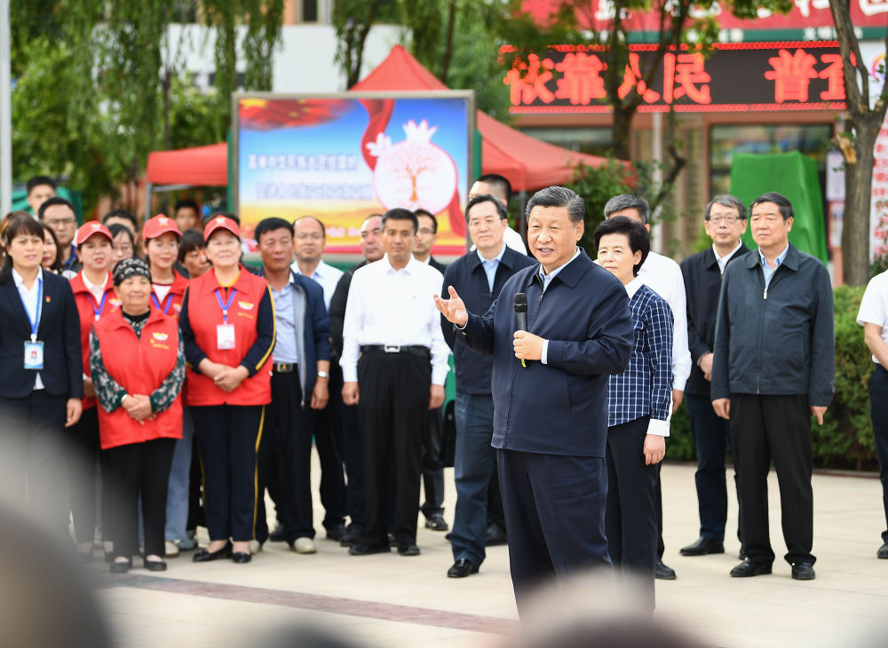 (2020年6月8日下午,習(xí)近平在吳忠市利通區(qū)金花園社區(qū)廣場,同居民們親切交流。新華社記者燕雁攝)