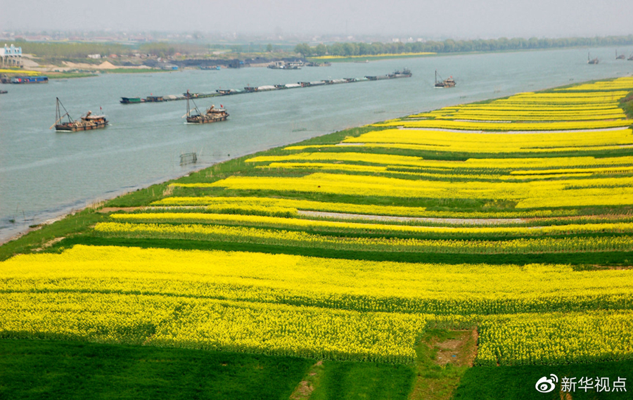 2008年3月27日,一支運煤船隊通過岸邊開滿油菜花的淮河淮南段。金黃色的油菜花和綠油油的麥苗使得淮河岸邊美景如畫。新華社發(陳彬攝)
