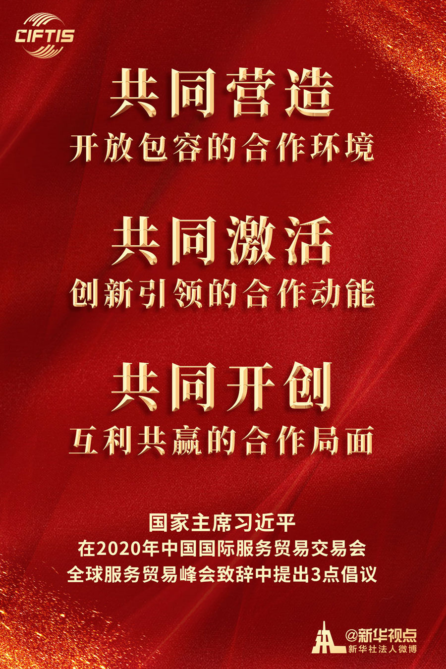 “建立健全跨境服務(wù)貿(mào)易負(fù)面清單管理制度”“繼續(xù)放寬服務(wù)業(yè)市場(chǎng)準(zhǔn)入”“主動(dòng)擴(kuò)大優(yōu)質(zhì)服務(wù)進(jìn)口”“加大知識(shí)產(chǎn)權(quán)保護(hù)”“支持組建全球服務(wù)貿(mào)易聯(lián)盟”“將支持北京打造國(guó)家服務(wù)業(yè)擴(kuò)大開(kāi)放綜合示范區(qū)”……習(xí)近平主席提出深化服務(wù)業(yè)開(kāi)放合作的新舉措新主張,賦予中國(guó)對(duì)外開(kāi)放新內(nèi)涵,也為全球共同發(fā)展注入新動(dòng)力。