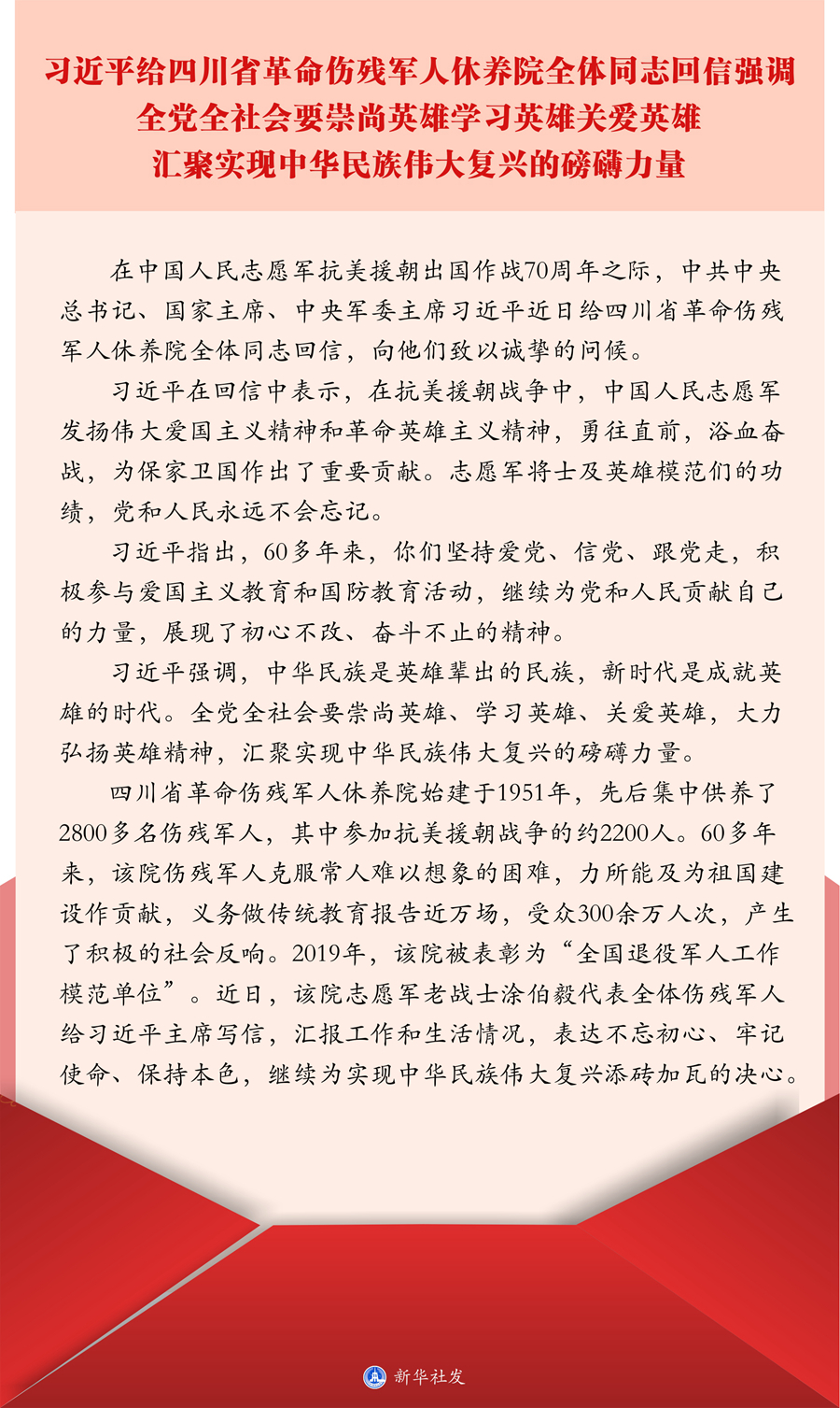 新華社北京10月21日電 在中國人民志愿軍抗美援朝出國作戰70周年之際,中共中央總書記、國家主席、中央軍委主席習近平近日給四川省革命傷殘軍人休養院全體同志回信,向他們致以誠摯的問候。