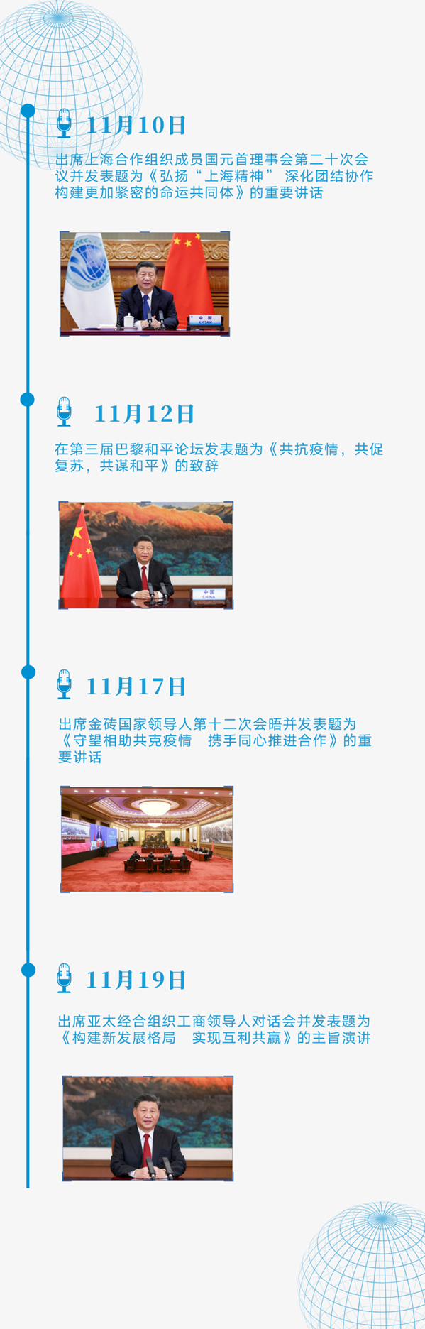 11月10日至22日,不到兩周時間,習主席以視頻方式出席4場多邊會議、一場國際論壇,發表8場重要講話、主旨演講和致辭,外交日程異常密集。