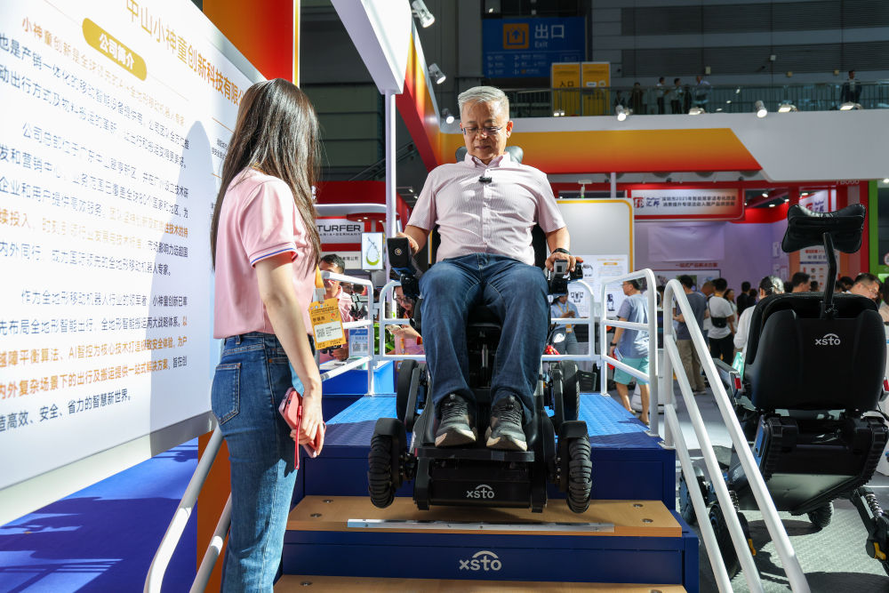 2025年9月12日,2025深圳国际智慧养老产业博览会在深圳会展中心(福田)开幕。展会汇聚了来自全球的260余家养老企业,集中展示智慧养老产品与系统性解决方案2000余项,覆盖智慧居家、智能服务机器人及康复辅具、康养旅居等领域。这是观众在展会现场体验一款可以上下楼梯的智能出行机器人。