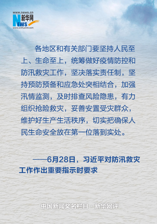 要堅持人民至上、生命至上。人民高于一切,生命重于泰山。無論防控疫情,還是抗洪搶險,都要切實把確保人民生命安全放在第一位落到實處。在做好疫情防控的同時,一定要有力組織搶險救災,強化應急搶險人員轉移安置,落實基層轉移避險的責任,細化避險轉移預案,在需要的時候果斷轉移有危險的群眾,妥善安置受災群眾,千方百計減少人員傷亡。