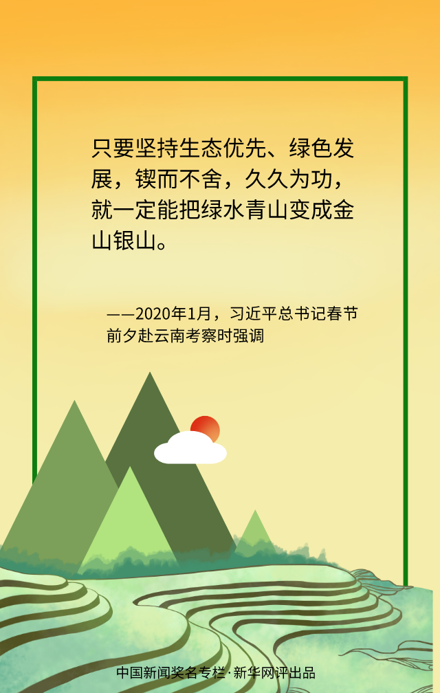 綠色發展道阻且長,但行則將至。生態治理、實現人與自然和諧共生仍有不少“硬骨頭”要啃。我們既要有除弊治病的決心,又要有遵循規律辦事的自覺,既要有只爭朝夕的精神,更要有持之以恒的堅守,以綿綿之力久久為功,腳踏實地地推進美麗中國建設,一處處“詩意棲居”的綠水青山必將變成一座座金山銀山。(文字:徐可 海報:滕華)