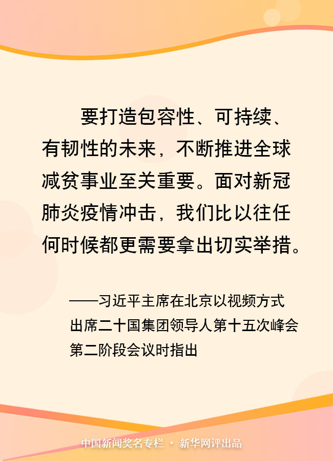 11月22日晚,習(xí)近平主席在北京以視頻方式出席二十國集團(tuán)領(lǐng)導(dǎo)人第十五次峰會第二階段會議,重點闡述關(guān)于可持續(xù)發(fā)展問題的看法。他指出,要打造包容性、可持續(xù)、有韌性的未來,不斷推進(jìn)全球減貧事業(yè)至關(guān)重要。面對新冠肺炎疫情沖擊,我們比以往任何時候都更需要拿出切實舉措。