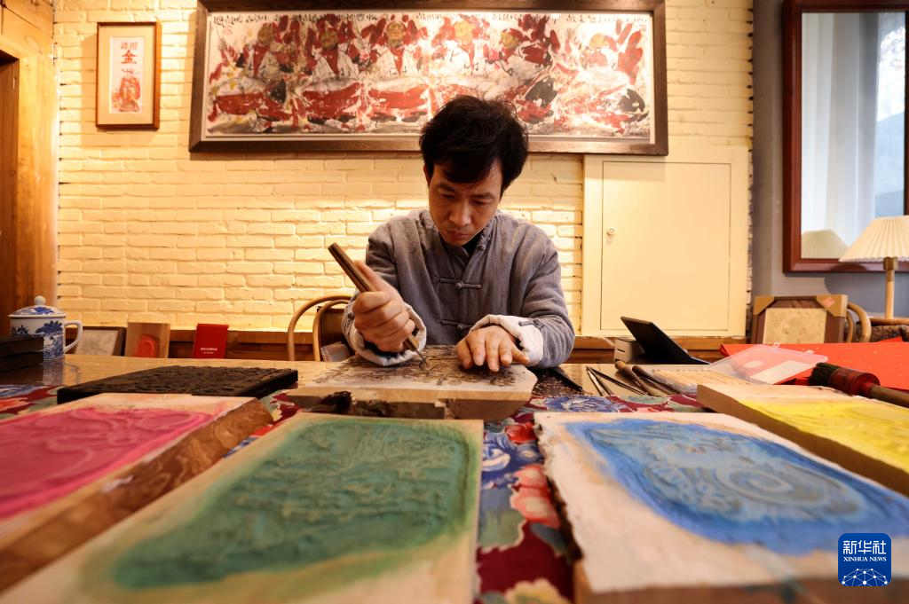 2月10日,在童寿记木版年画工作室,童敏在进行年画刻版。