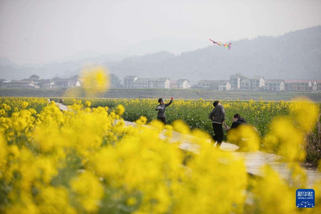 2月26日,在重庆秀山土家族苗族自治县清溪龙凤花海景区,小朋友在油菜花田间放风筝。