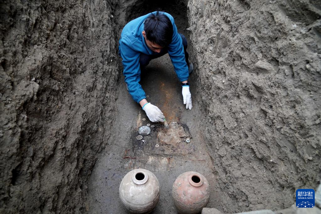 工作人员在宋国故城遗址内的唐代墓葬进行清理作业(3月25日摄)。