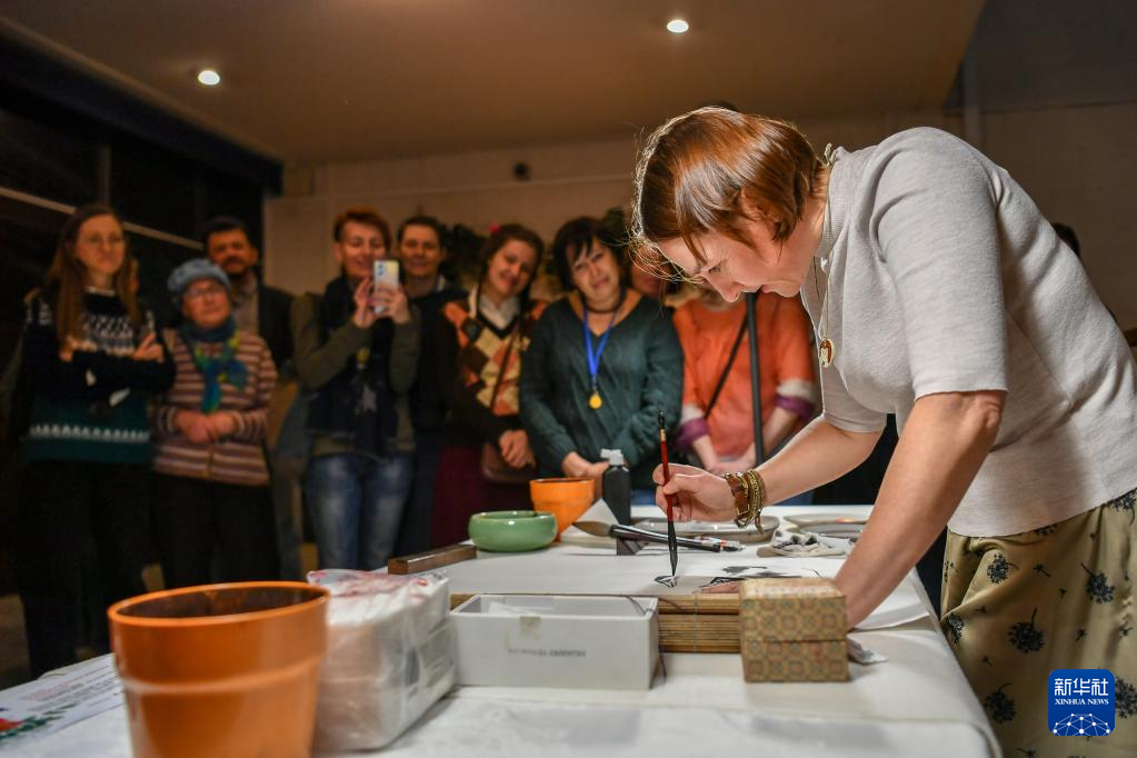 3月30日,一位参展者在俄罗斯莫斯科达尔文博物馆中国绘画展上现场作画。