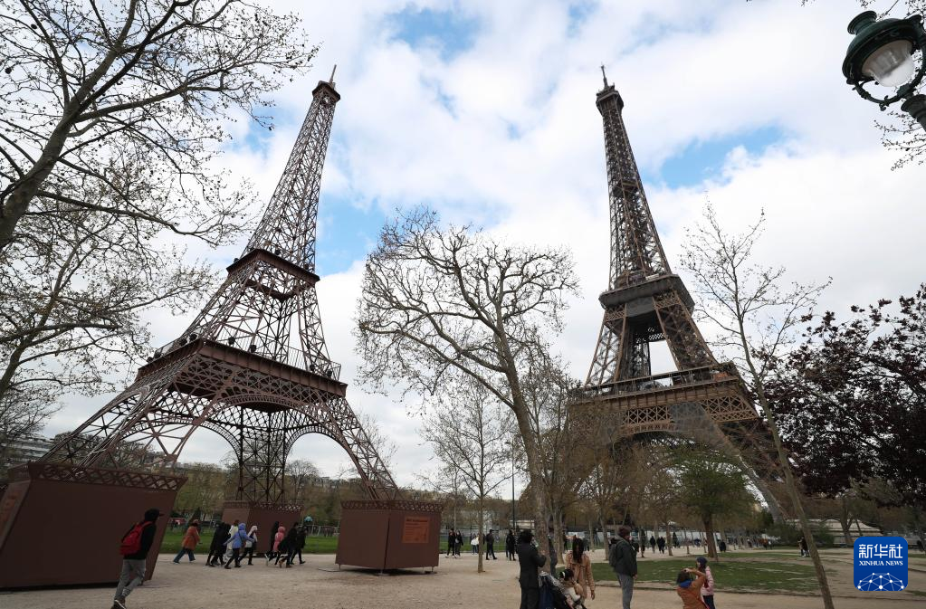 这是4月3日在法国巴黎拍摄的埃菲尔铁塔(后)和“小埃菲尔铁塔”。