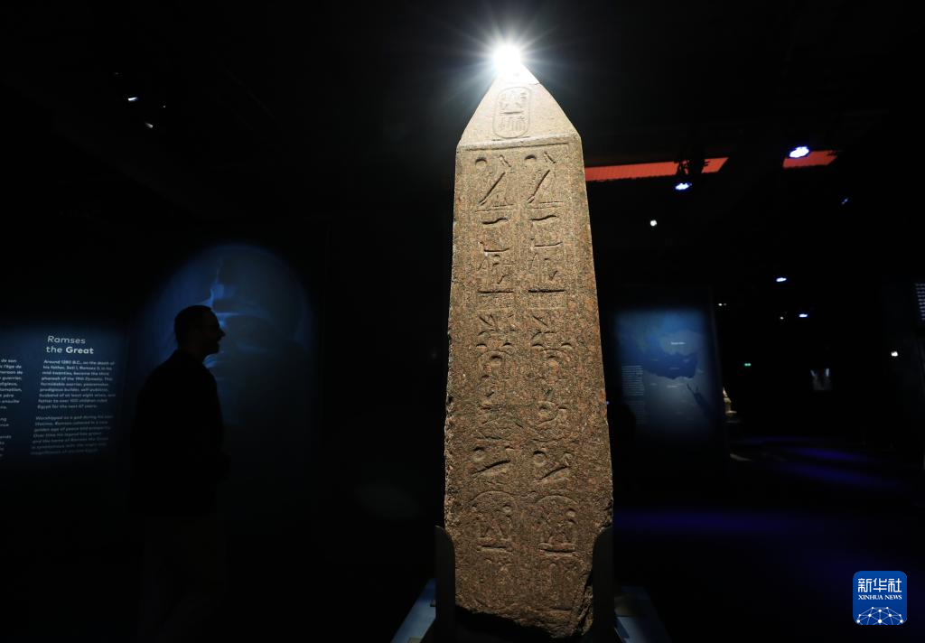 4月6日,媒体记者在法国巴黎参观刻有拉美西斯二世名字的方尖碑的一部分。