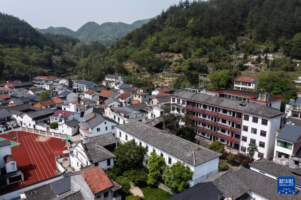 这是4月12日拍摄的诸暨市东白湖镇有着百年历史的斯民小学(无人机照片)。