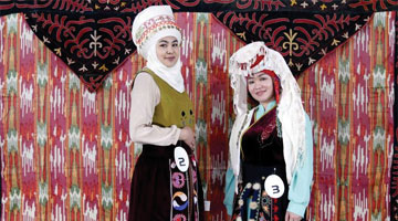 4月15日,在吉尔吉斯斯坦首都比什凯克,两名女子展示吉尔吉斯斯坦传统服饰。