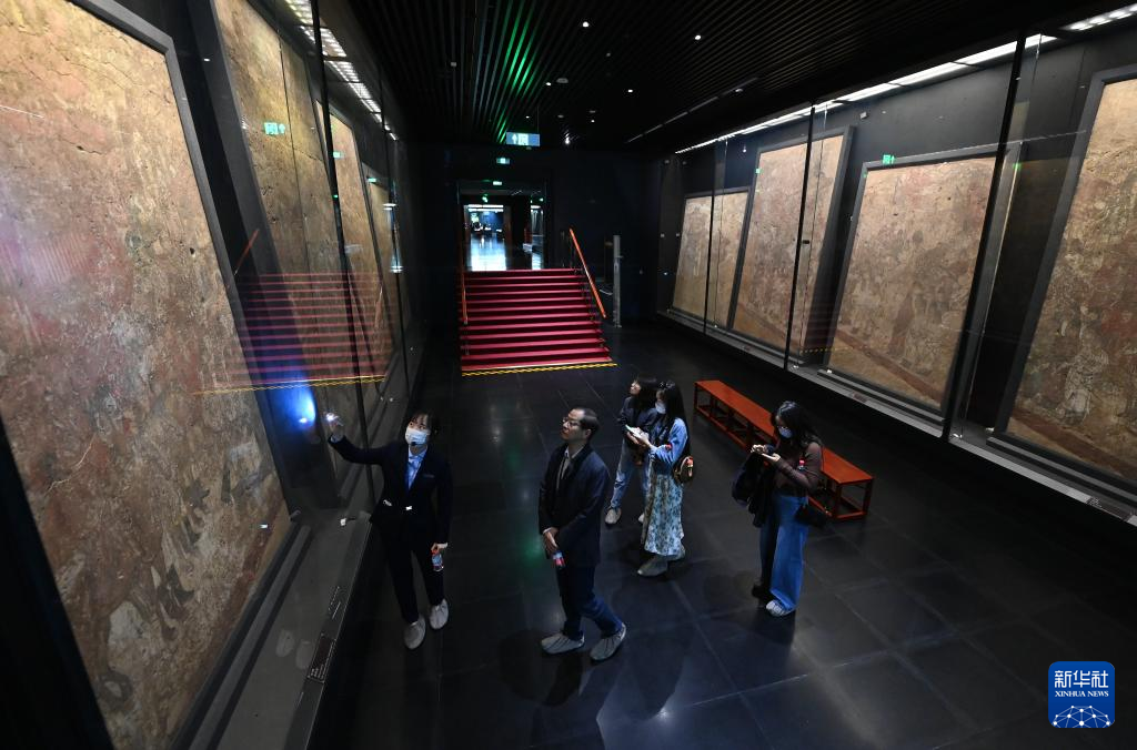 5月11日,游客在陕西历史博物馆唐代壁画珍品馆内参观绘制于懿德太子墓的《阙楼仪仗图》。