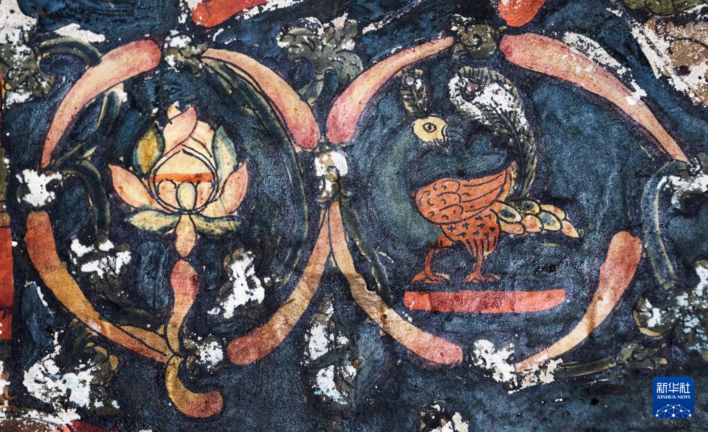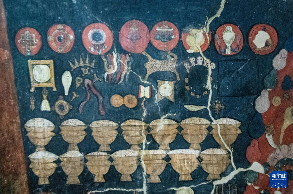 这是5月26日拍摄的皮央石窟壁画中的吉祥八宝。