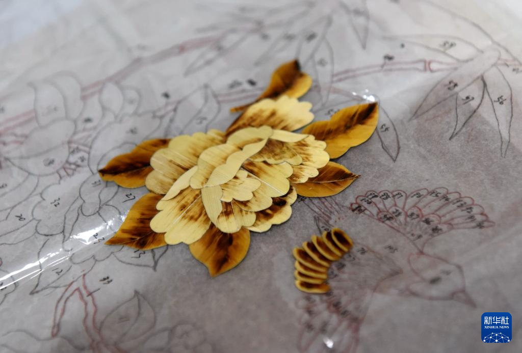 7月12日,吴永龙将麦秆画“零件”摆放在桌面上。