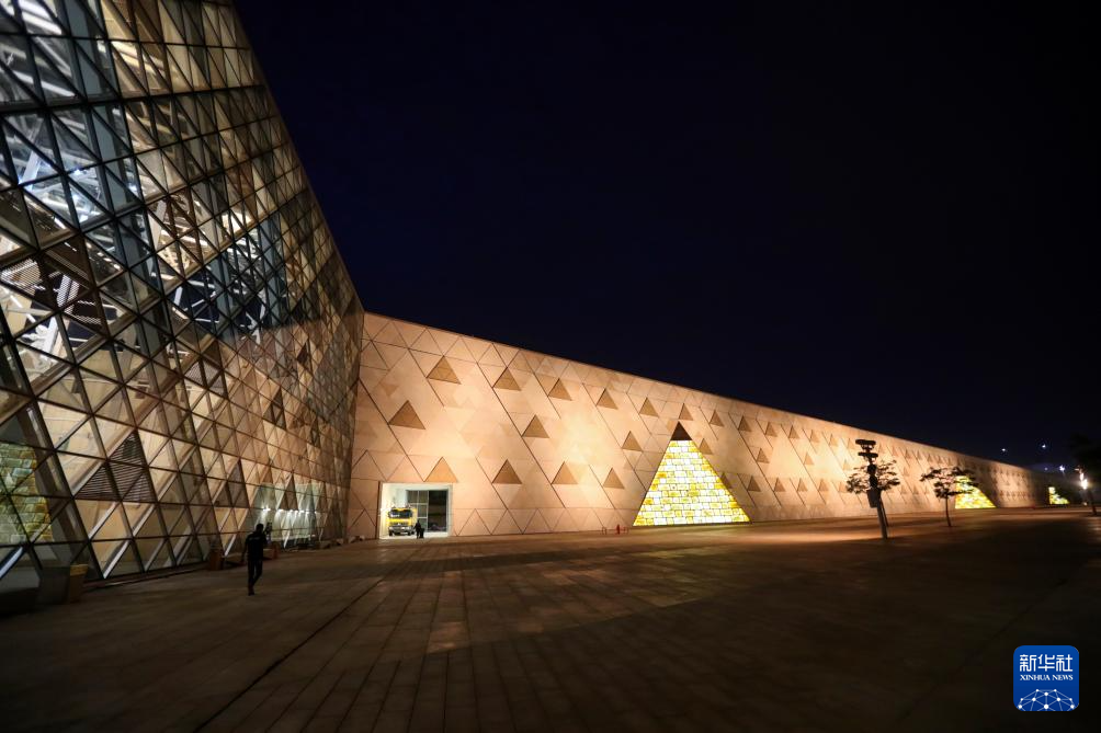 这是10月8日在埃及吉萨省拍摄的晚上亮灯的大埃及博物馆。