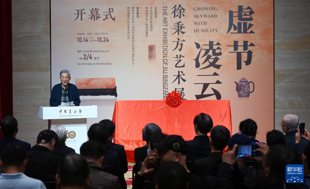 当日,“虚节凌云——徐秉方艺术展”在中国美术馆开幕。徐秉方是国家级非物质文化遗产常州留青竹刻技艺代表性传承人。本次展览展出徐秉方先生和其父亲、女儿三代人所作竹刻、书画、壶刻精品百余件,展览将持续至10月24日。