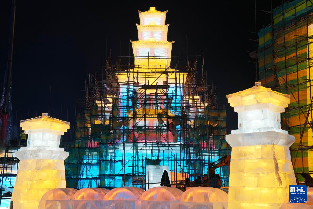 12月14日,工人在哈尔滨冰雪大世界园区建设现场施工。
