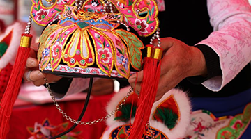 1月28日,在年俗主题市集上,一名棕编非遗技艺传承人展示迎龙年主题的造型帽子。