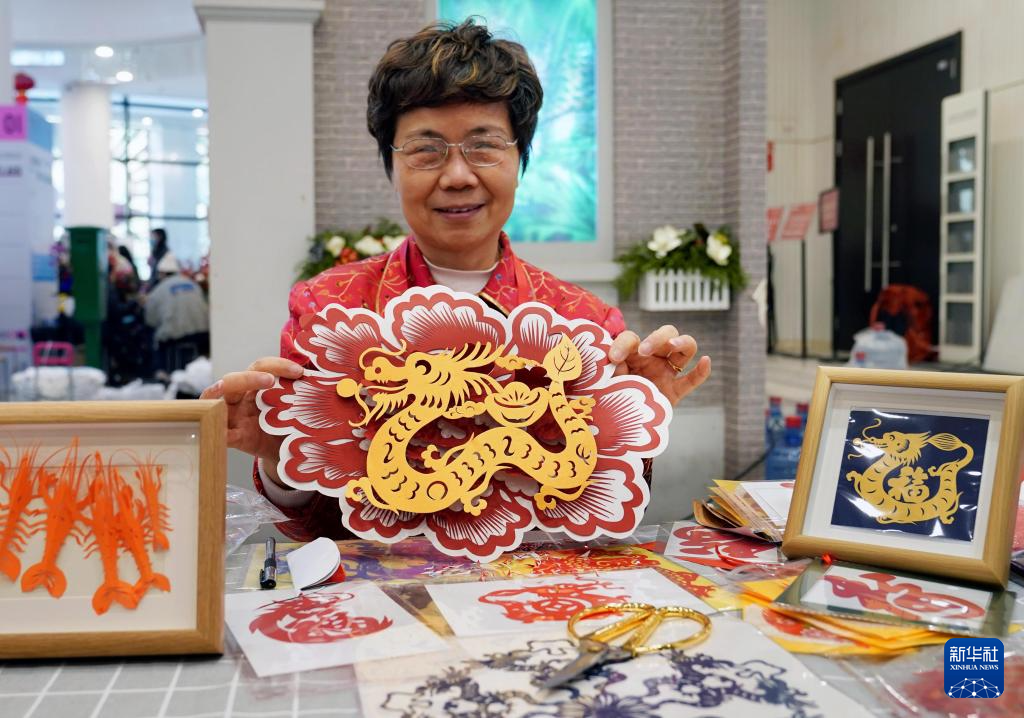 1月28日,艺术家在年俗主题市集上展示龙年主题剪纸。