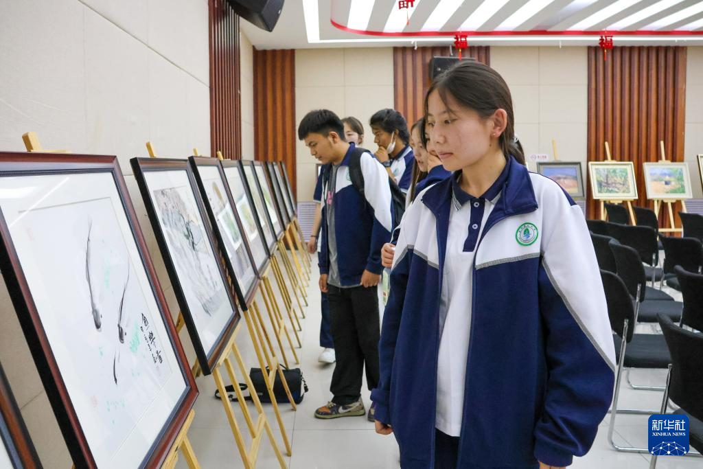 7月7日,在新疆克州阿图什市新时代文明实践中心,学生参观作品展览。