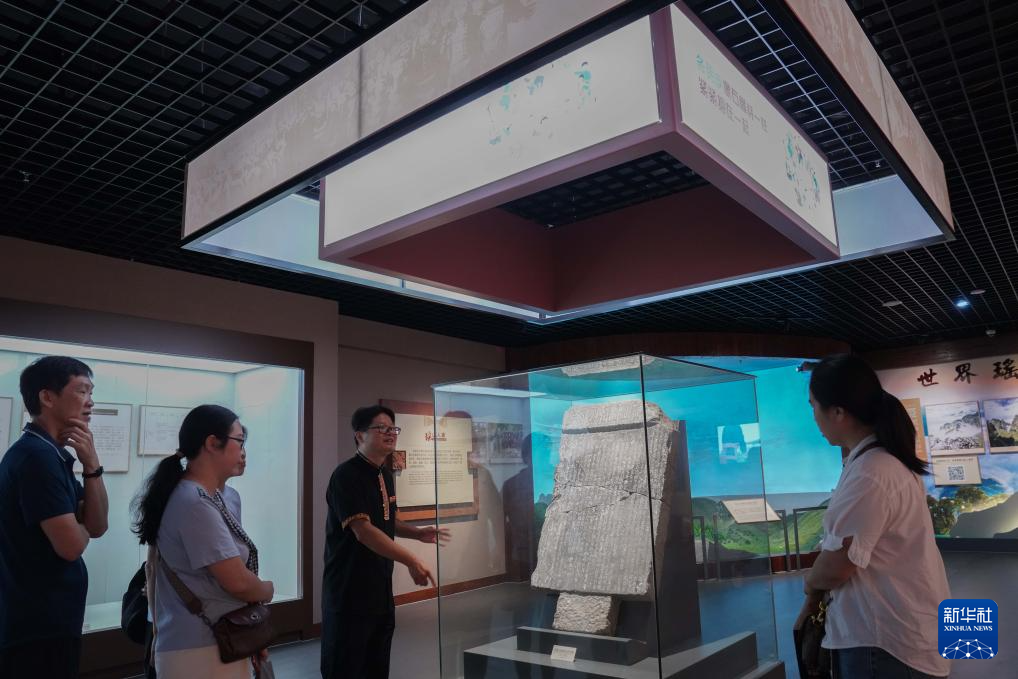 8月24日,讲解员在位于南宁的广西民族博物馆“铸牢中华民族共同体意识历史文化展”上介绍“三鱼共首”石刻图案 。