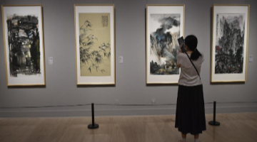 9月12日,游客在柳州市群众艺术馆观赏三江农民画。